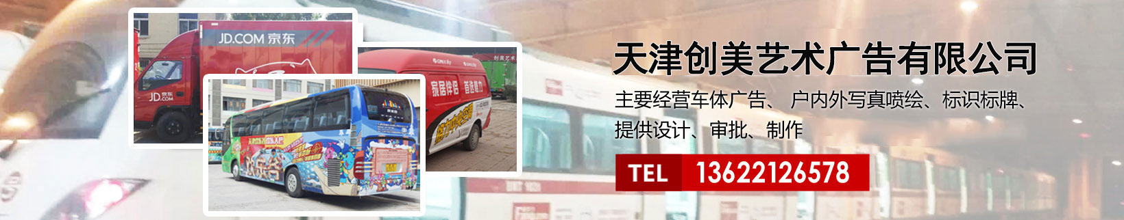 天津創(chuàng)美藝術(shù)廣告有限公司主要經(jīng)營車體廣告、 戶內(nèi)外寫真噴繪、標識標牌、提供設計、審批、制作、發(fā)布的服務。